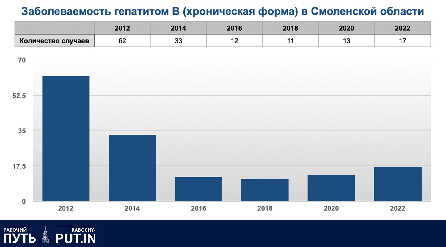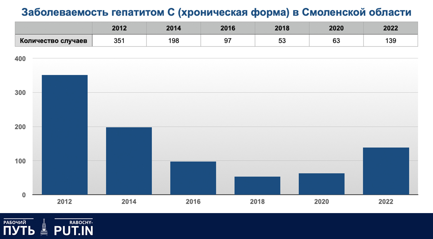 После резкого уменьшения количества новых случаев острой формы гепатита В и С в Смоленской области в 2016, показатель стабильно увеличивается. В 2022 году гепатит В выявили у 17 местных жителей, в то время как в 2016 — у 12. В разы больше выявляют гепатит С у смолян: если в 2016 году зафиксировано 97 случаев, то в 2022 — уже 139.